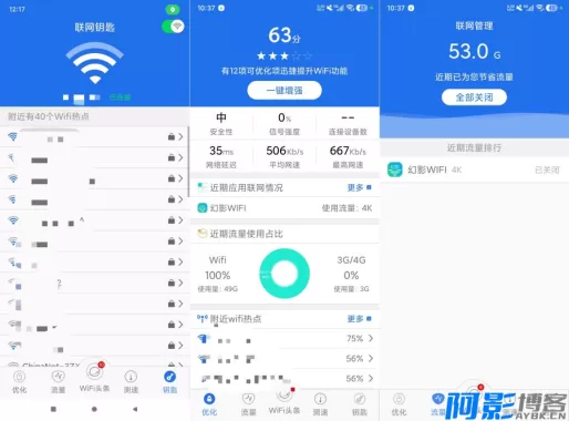 【应用名称】幻影WIFI【适用平台】安卓【应用版本】3.0【应用大小】8.84M【应用简介】1、【免费上网】免费Wi-Fi,随时随地免费连接,从此再也不用担心流量问题,任性地在网上看世界。2、【安全快捷】快速检测Wi...