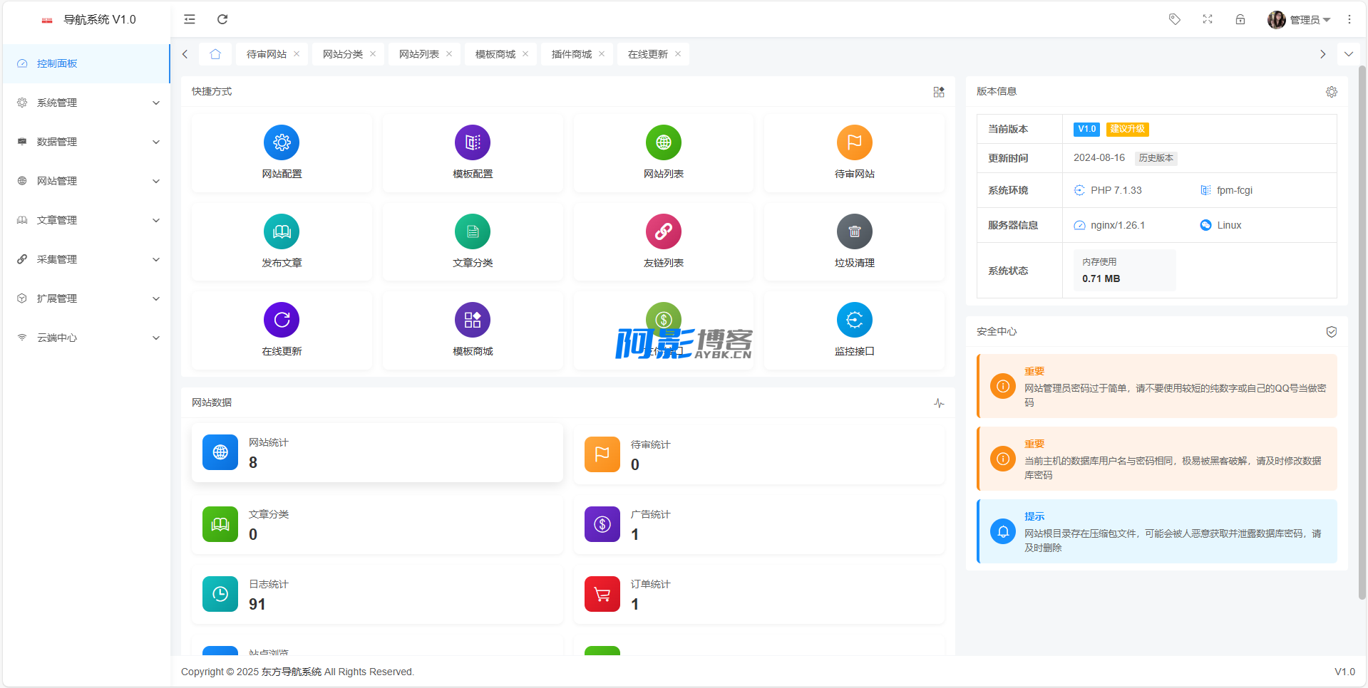 | 东方导航系统 V1.0 版本采用先进 PHP 架构, 支持多模板切换、SEO 优化、响应式设计, 具备完善的后台管理功能,是构建专业导航网站的理想选择。 为站长提供一站式导航建站服务,内置丰富网站分类、智能推荐算法、助力打造高质量的网址导航平台。 集成网站收录审核、分类标签管理、访问统计分析、广告位投放等功能模块,操作简单易用。 帮助企业快速搭建专业导航门户,支持付费推广、流量变现等商业模式,是网站运营者的得力工具。 专注于网址导航领域,提供从网站收录到内容管理的全套解决方案,已服务众多导航站长,口碑优良值得信赖。 若遇到搭建后出现未授权 右下角 可以发送你的域名和 QQ 开通 |