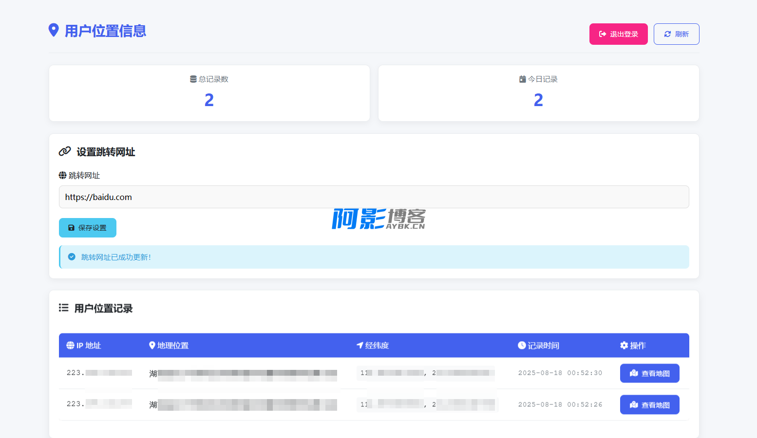 一款能够获取网站访问者ip的程序,通过链接访问可提取访问者ip定位,链接可自定义设置跳转目标网站,实测定位误差1公里之内,带后台无需数据库