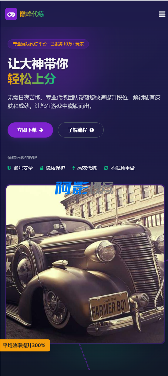 内容替换简单:所有图片使用占位图服务(picsum.photos),替换时只需修改图片链接 价格调整方便:价格数据直接写在 HTML 中,无需修改 JS,非技术人员也能操作 样式统一可控:通过 Tailwind 变量定义主色调,修改一处即可全局变更,保持视觉一致性 整体而言,这个精简版模板在 “轻量” 和 “实用” 之间取得平衡,既去掉了非必要的装饰性元素,又保留了代练业务所需的核心功能,特别适合需要快速上线、注重转化效果的中小代练团队使用。