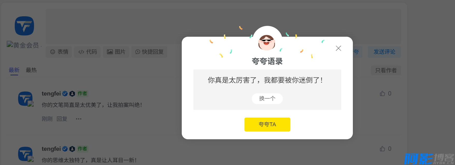 | 给子比主题评论的地方加一个夸一夸的插件,非常的快捷方便,方便的可以使用,快速插入到子比主题评论区并且自动发送评论,非常方便 |
