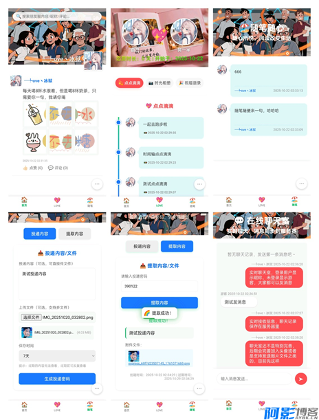 全站无刷新,聊天室实时接收和发送消息,朋友圈首页点击头像登录管理员账号密码:admin/123456,登录后其它页面会有管理员专属发布和修改按钮,恋爱日记的时光相册怎么使用可在我之前发的帖子里找,这里就不多讲了