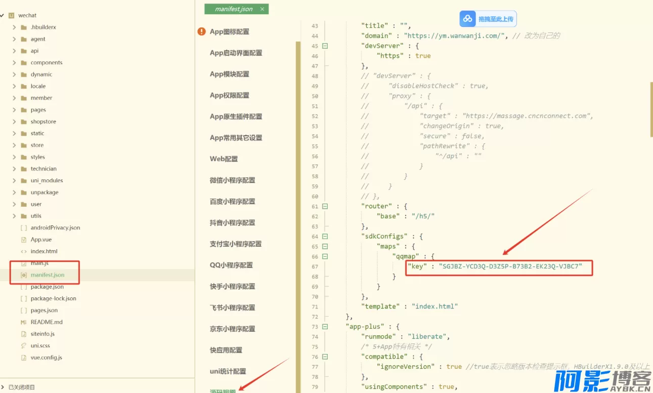 3、基础配置分配Appid、源码视图设置腾讯地图key和公众号id