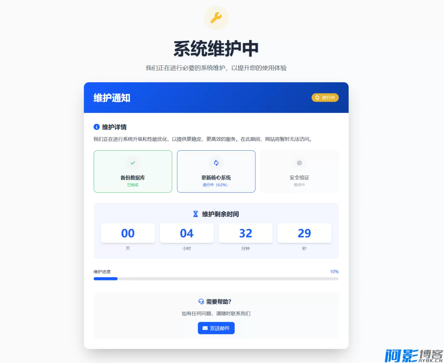 | 自适应手机和电脑端,页面简洁美观,有三个页面,维护前、维护中、维护完,无后台,内容在首页index文件修改 只需要设置好维护开始和结束时间,会自动依次按顺序显示三个页面,倒计时结束后会一直显示维护完成页面 |