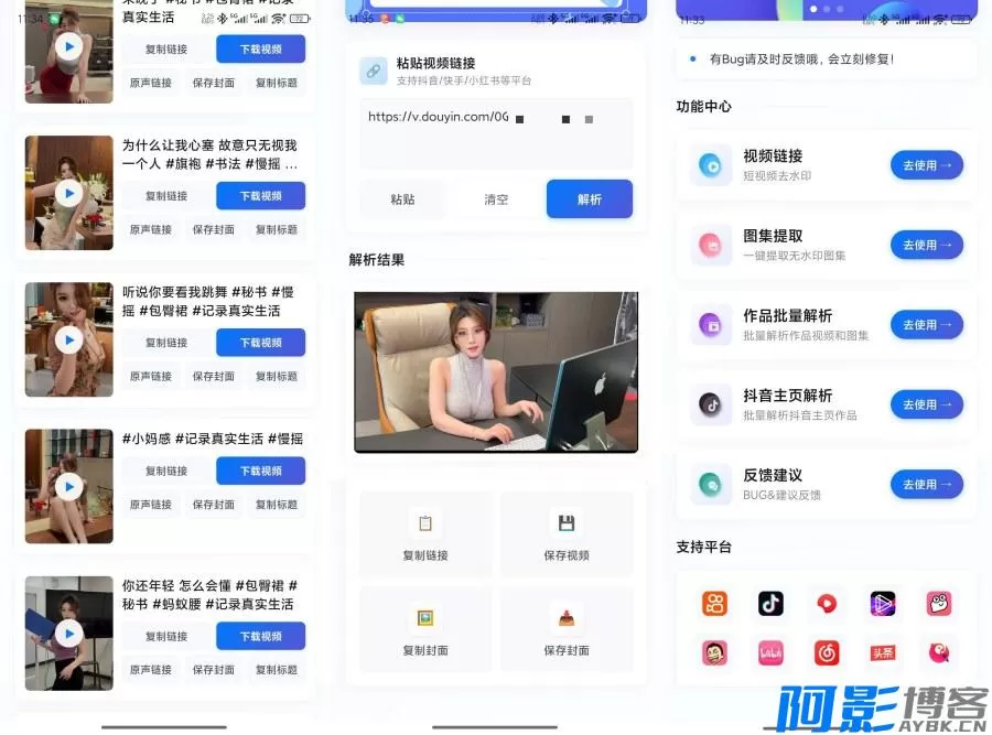 支持:快手,抖音,小红书,哔哩哔哩,皮皮虾,等多款应用去水印,支持图集解析批量下载