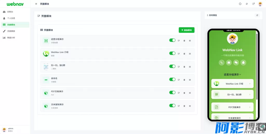 **模块类型**:链接模块、二维码模块、分组标题、PDF 等。