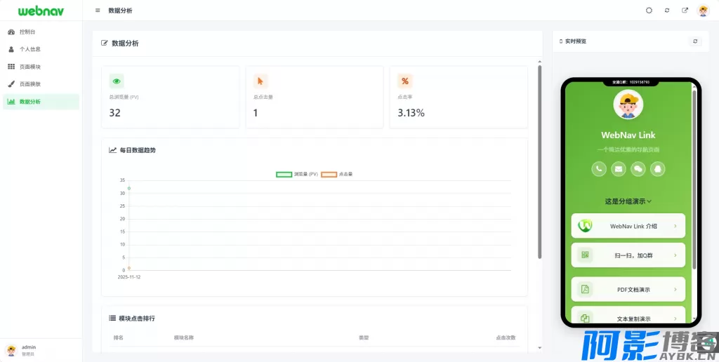 **仪表盘**:今日 PV、累计 PV、累计点击、点击率等关键数据一目了然。