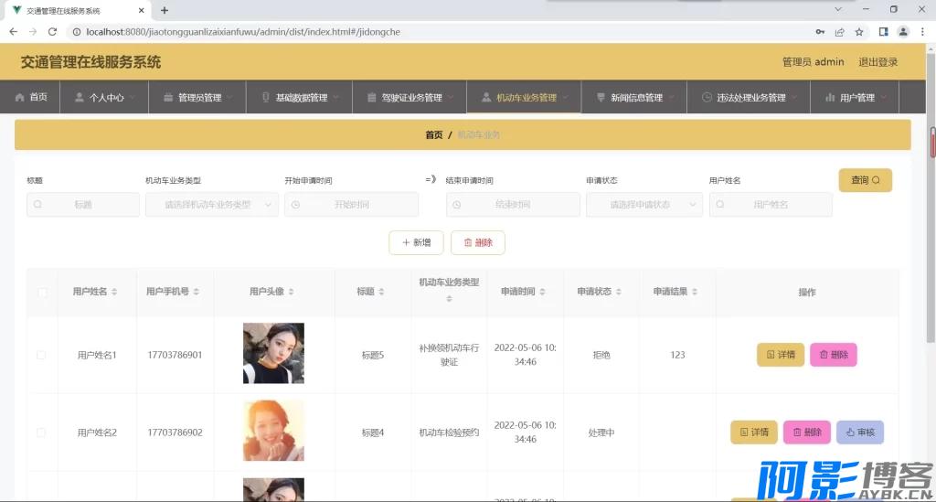 - 管理员可查看所有用户提交的驾驶证相关申请(如换证、补证、增驾等)