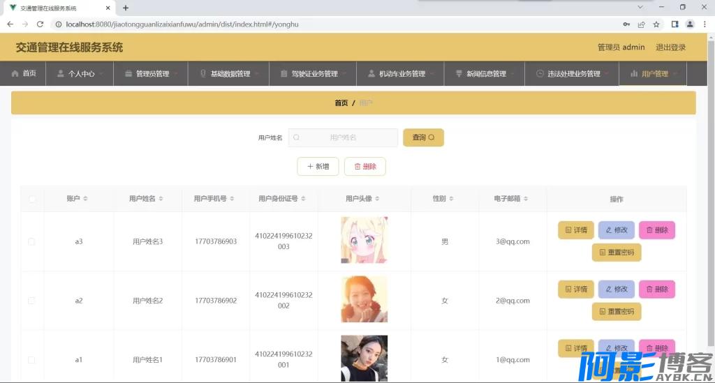 - 管理员可对所有注册用户进行 查询、新增、修改、删除 操作