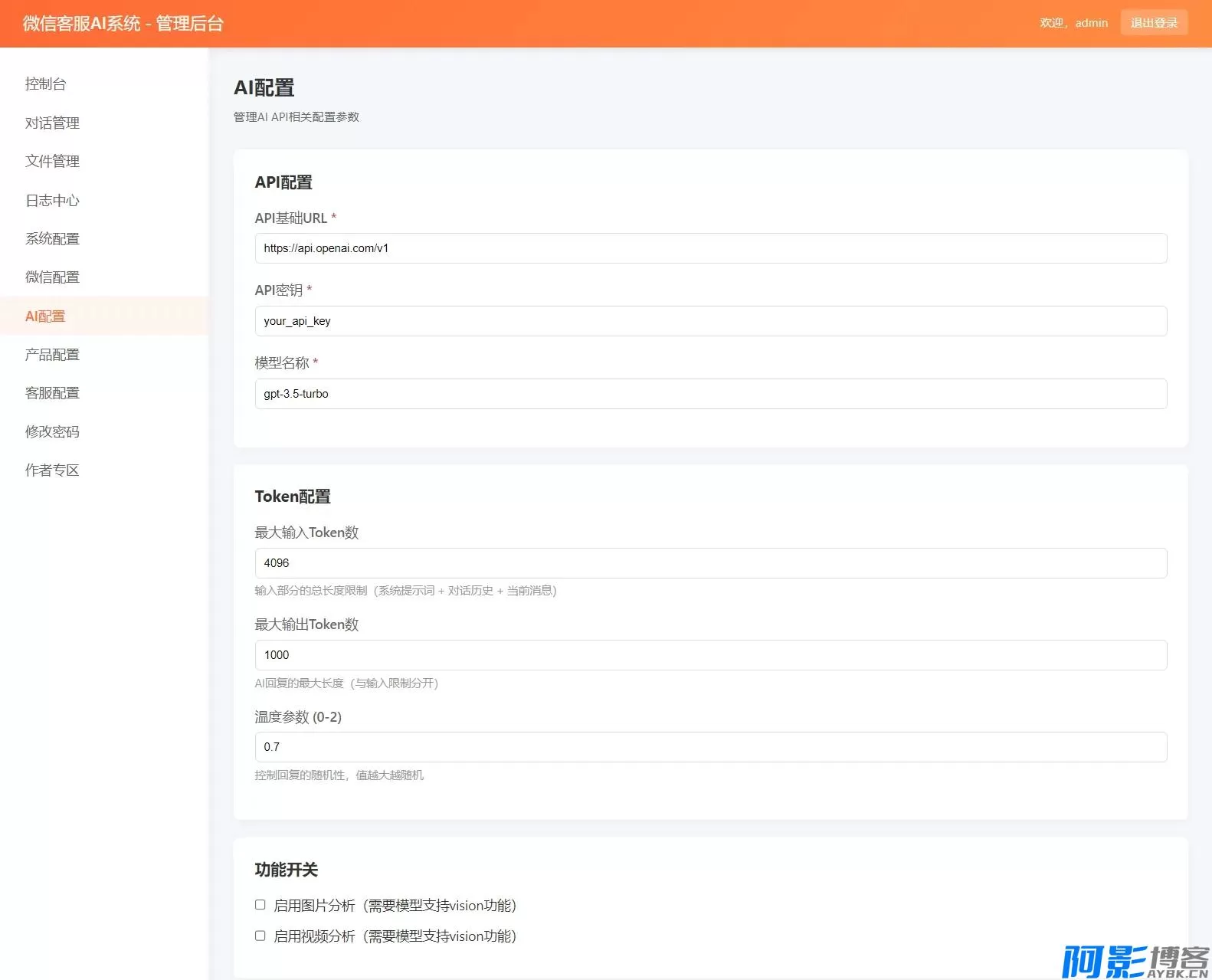 – ** 客服配置 **:配置人工客服 ID、转接关键词、提醒设置等