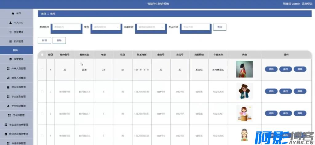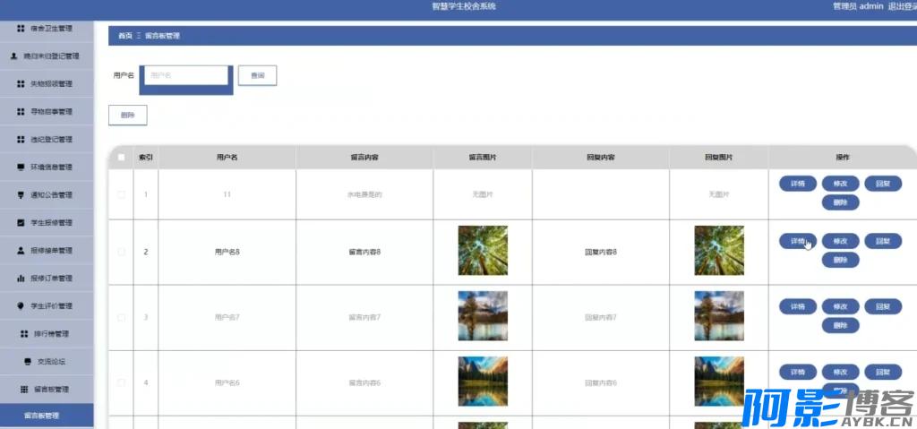 对宿舍管理员账号进行增删改查,绑定其负责的楼栋范围,实现分区责任制。 - 宿舍楼管理
