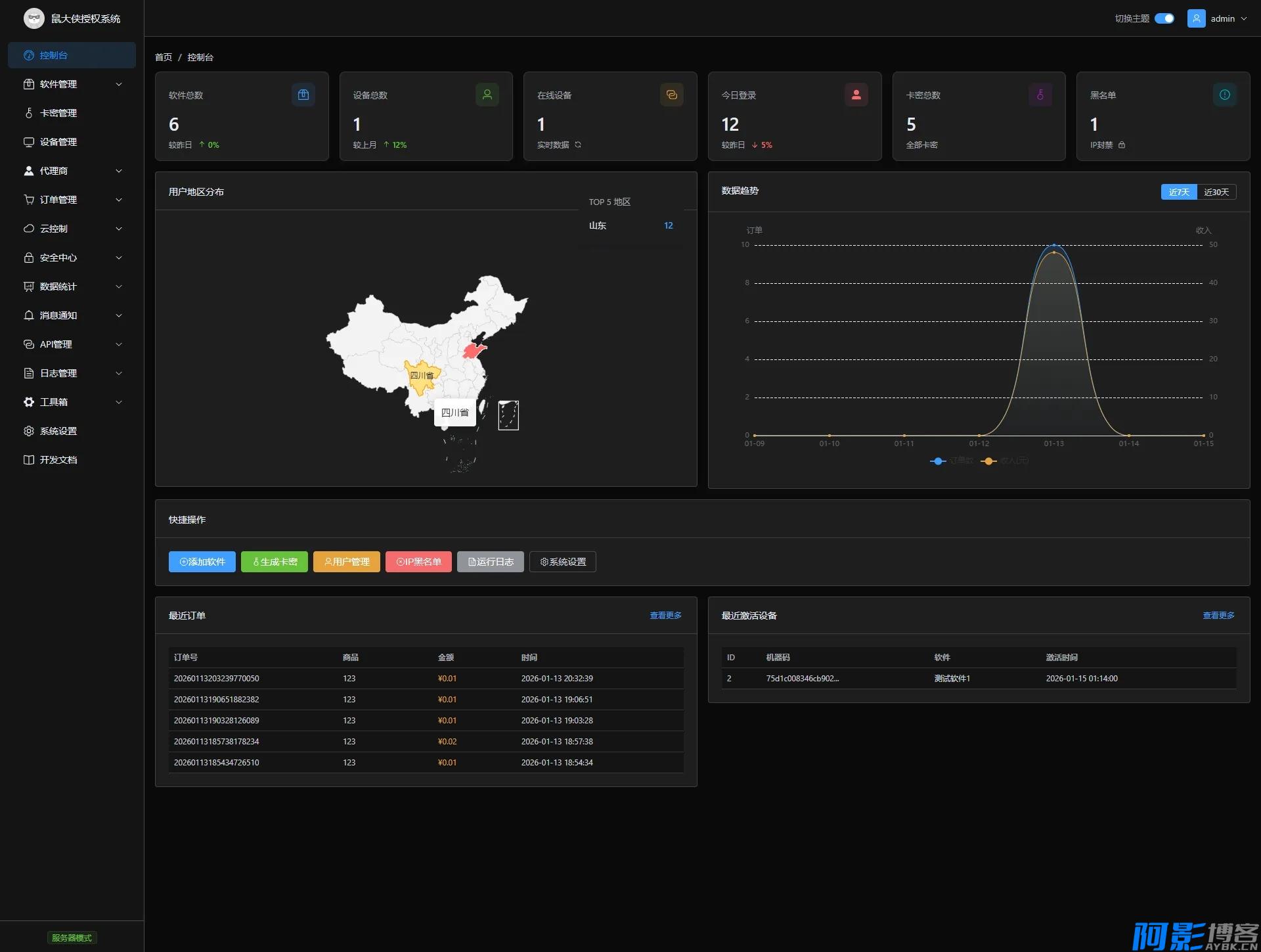 数据统计:控制台实时展示软件数、设备数、在线数、今日登录等数据