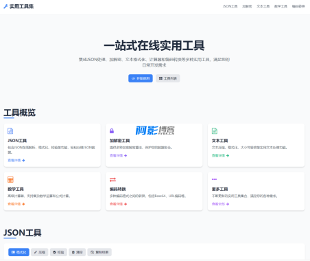 这是一款集成多种实用工具的网页,包含 JSON 处理、加解密、压缩格式化、文本工具、计算器和编码转换等功能。页面设计将采用现代 UI 风格,确保用户体验流畅且功能完整。这个多功能在线工具网页包含的所有功能:J...