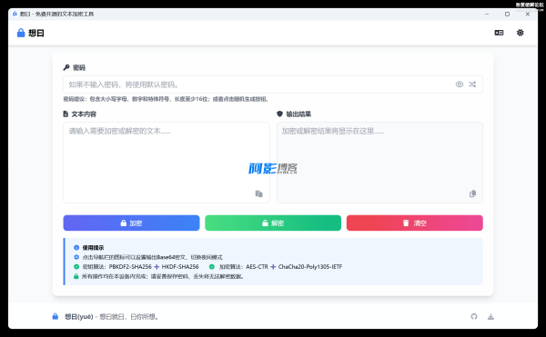 想曰(yuē)是基于现代加密技术的文本加密工具,使用多算法级联加密方案,确保数据在本地完成加密/解密,保护隐私安全。 🌟 特点 ㊙️密文:支持中文/Base64/Emoji/零宽/日语/韩语/象形密文 🔐密钥:Argon2id + HKDF...