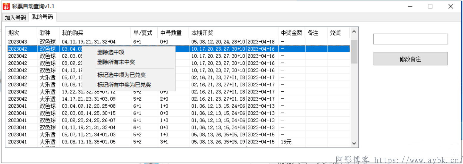 2.添加右键菜单功能(删除选中,删除所有未中奖,标注为已兑奖)//这个方便彩票店主使用
