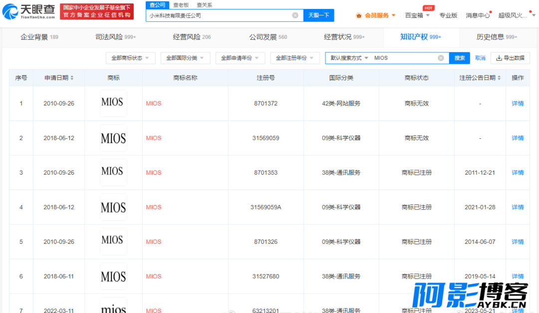 其实,从时间线来看,最早在 2010 年就出现与 MIOS 有关的消息。天眼查App显示,小米科技有限责任公司从2010年开始陆续申请注册多个“MIOS”商标,国际分类包括科学仪器、通讯服务、网站服务,目前,这些商标状态多为已注册。