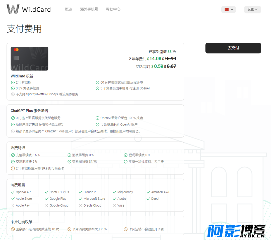 6.注意看清楚页面所有的权益和注销政策以及收费等明细,没问题就可以点击“去支付”进行开卡费用的支付,支付成功后即可成功开通美国虚拟信用卡。如果你通过 zhangzifan.com/go/wildcard 开始注册或输入了“LEIXUE”邀请码,页面就会显示“已享受邀请 88 折”。