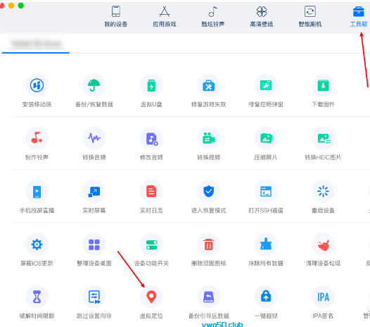 电脑上打开爱思助手,打开工具箱,选择虚拟定位。