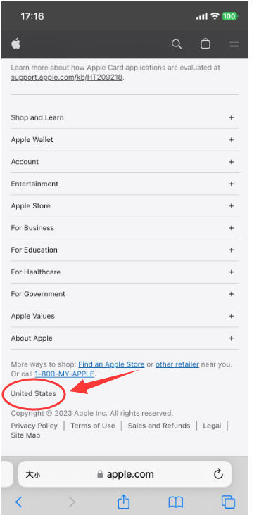1.打开苹果美国官网(http://www.apple.com)。切换成美国,可以将页面滑动到最底部,确认页面最下面是美国。