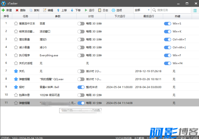 3.支持100+种任务类型,如消息提醒、关机休眠重启等、挡屏休息、音量调节、静音,窗口、显示器控制;多媒体声音、整点/半点语音报时、截图、录音录像,程序、进程、服务等操作;更换壁纸,系统清理,网络操作,热键转发,笔记本盖子等等,应有尽有