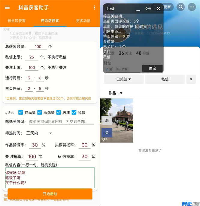 比如可能打关注或点赞,自己账号包装下设置好钩子,也可以直接去私信用户。只要频率设置正常两三分钟以上,不要太快,话术不要有敏感词,这种截流方法还是比较安全的。