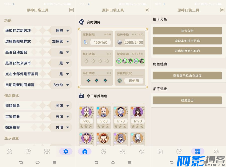 软件内部登录后,即可进行抽卡分析,可以查看原神内的树脂、洞天宝钱、每日委托等数据的实时信息,同时有多达十几款不同样式的桌面小部件可供选择,还有可爱的的胡桃桌宠哦。软件内部还可以看到已拥有所有角色的基本信息