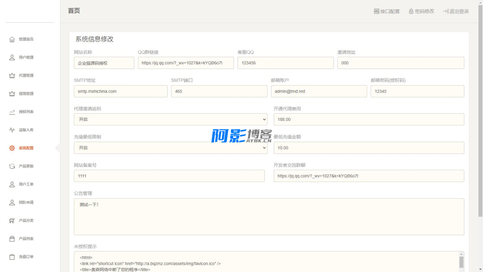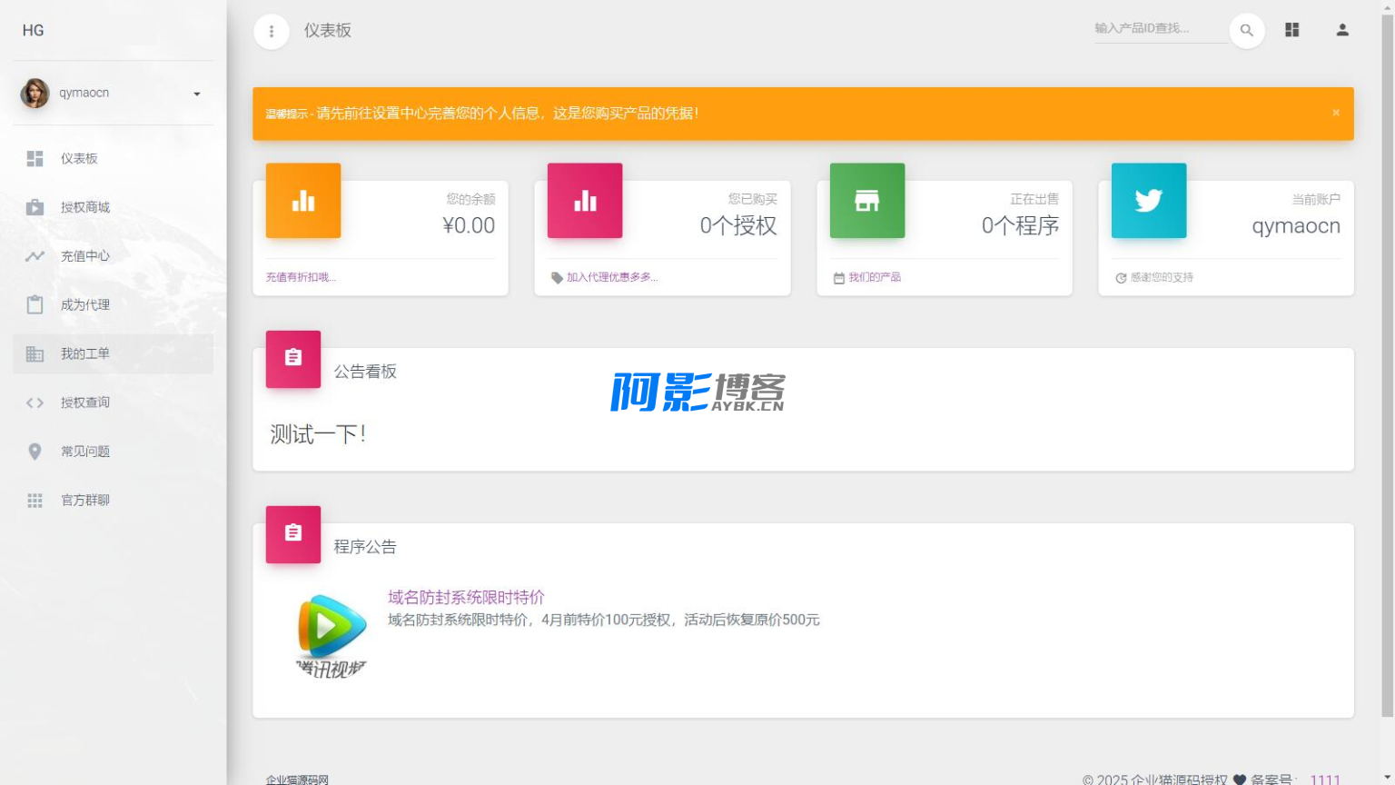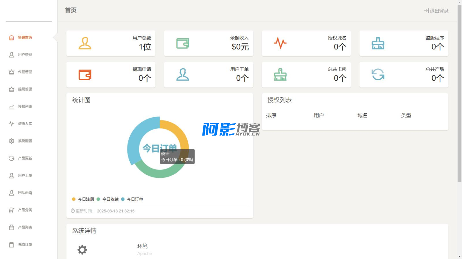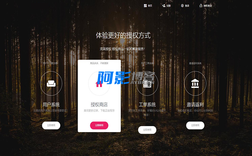功能最多的授权系统,用户系统,工单系统,精美UI,支付系统,授权管理,产品更新,更新详情,代理返利,发卡系统,授权系统,盗版入库,团队模式,常见问题,等你来体验!