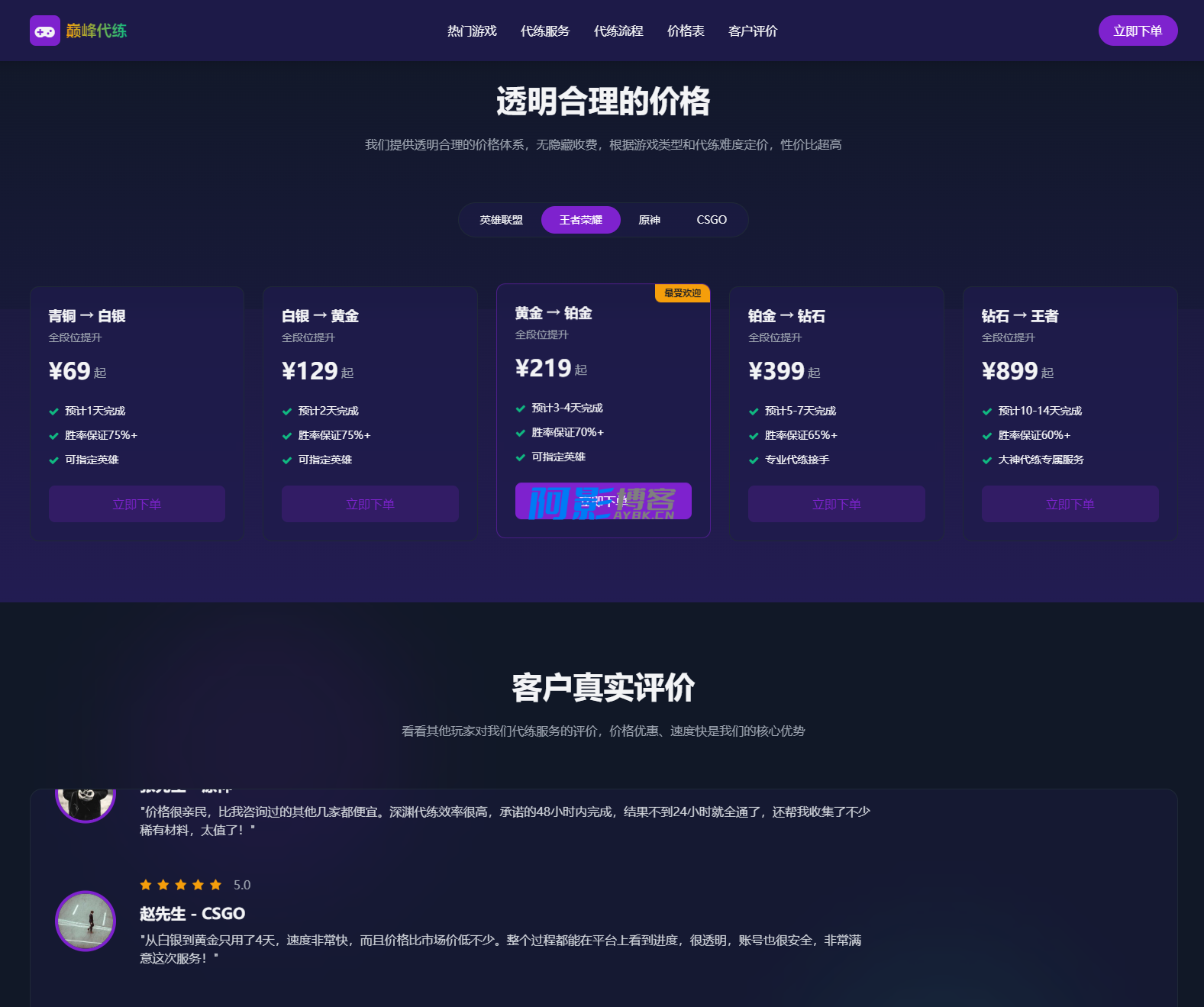 游戏分类展示:以卡片形式呈现热门游戏(英雄联盟、王者荣耀等),包含游戏图标和核心服务类型,用户可快速找到对应需求 价格表切换:支持 4 大游戏价格一键切换,每个游戏包含 5 个主流段位 / 服务套餐,标注 “最受欢迎” 选项,降低用户决策成本 客户评价滚动:自动垂直滚动展示真实用户反馈,内容聚焦 “价格优惠” 和 “速度快”,悬停时自动暂停,兼顾浏览效率和阅读体验 一键下单入口:导航栏、服务卡片、价格表等关键位置均有醒目的 “立即下单” 按钮,形成转化闭环