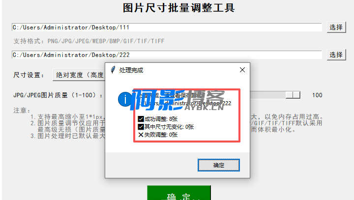 点击“确定”按钮可按照设定的参数执行尺寸调整。最后输出统计信息。若尺寸调整前后没有变化,则直接将源图复制,也计算为成功调整,但也单独显示无变化的图片数量。