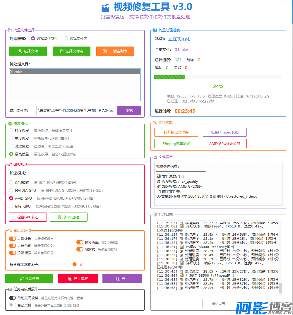 | 前几天自己弄了一个nas 有一些视频不是很清晰,我就自己动手用python写了一个画质修复软件,视频修复速度取决于显卡的情况,我自己写的完全免费,不存在任何广告,也没有任何后门,python脚本写的 支持文件修复和多个文件修复也支持单个文件,支持选择修复质量。完全免费,完全免费,完全免费, 由于我没有nvidia的显卡我只测试了amd显卡,我本机是6900xt 讯景的 cpu模式也测试了没有问题 我把原代码发过来你们自己稍微修改一下应该是可以兼容的 下面是源代码下载地址。有能力的大神改一下就可以了,随便改,随便搞,无版权限制, |