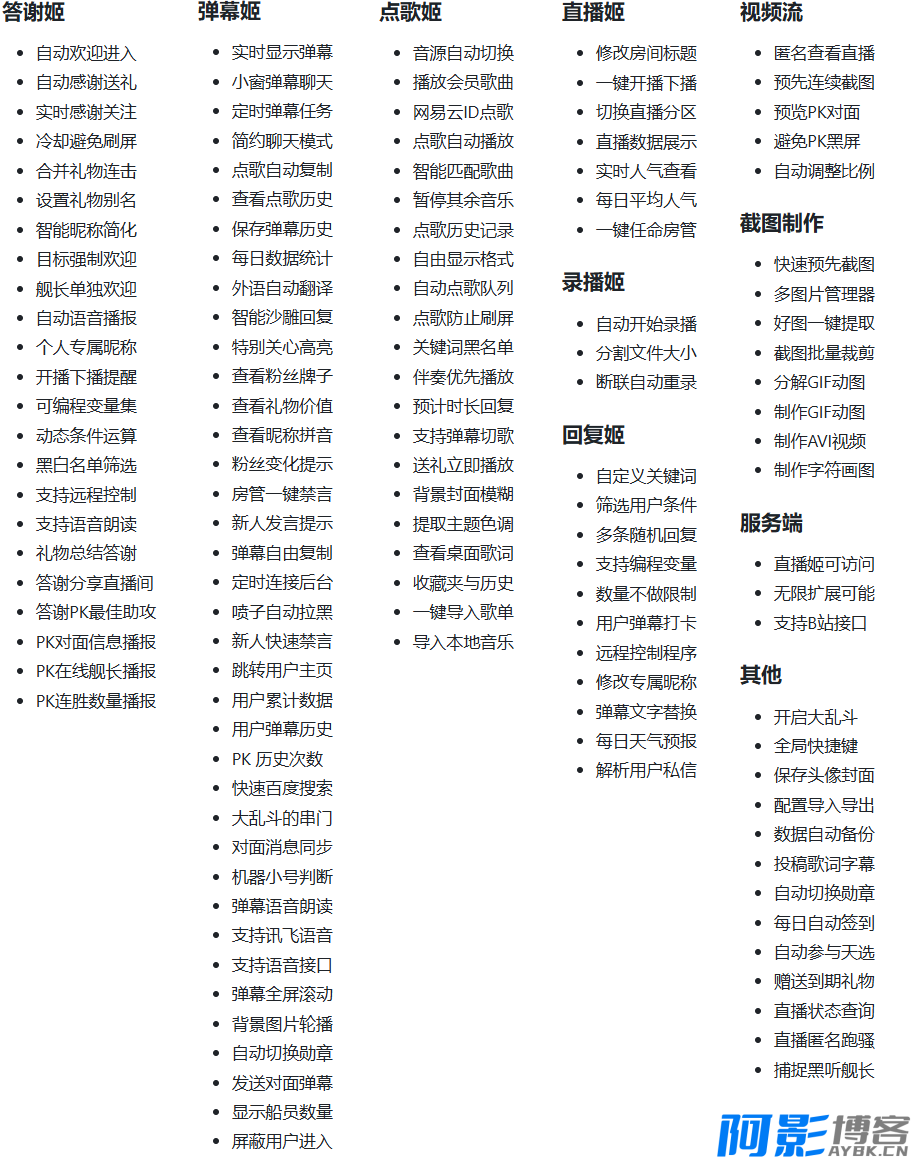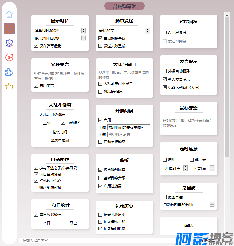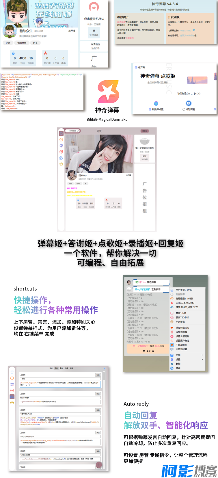 | 神奇弹幕以直播间为平台,利用 AI 大模型、网络通信技术、音视频技术、智能控制技术将直播有关的功能集成,构建高效的现代化播出环境与观众互动的管理系统,提升直播亲密性、便利性、艺术性,并提供全方位的信息交互功能。通过网络化综合智能控制和管理,实现“以人为本”的全新直播体验。 整合弹幕姬+答谢姬+点歌姬+回复姬+多种大模型AI+工作流(workflow),支持弹幕聊天、观众互动与管理、数据统计与分析、自动点歌、私信处理、AI自动闲聊、AI直播建议等。最大的特点是可编程控制,像搭积木一样设置各种互动规则,打造专属直播风格! 本程序以打造自动化直播间为主线,以建设高粘性粉丝团体为目标,保持观众互动,实现粉丝裂变,打造直播高峰,做有温度的直播助手。与此同时,规范观众行为秩序,促进直播产业健康有序发展,营造清朗的网络环境。 神奇: 完全支持 AI 的直播工具,智能聊天、数据分析、粉丝档案 直播数据全部备份,永久保存到数据库,自定义筛选条件 主播秘书,一键上播下播、修改分区,直播数据收集与整理 根据约束条件(时间、等级、勋章等),按条件智能欢迎/答谢 外语自动翻译、AI闲聊回复、生僻字读音等自动化功能 粉丝变化、热门榜、大乱斗、船员变化、新人发言等种种数据 大乱斗查看双方串门的粉丝、同步视频PK对面消息、跑骚抓人 私信处理、感谢分享、最佳助攻、打卡回复、语音播报等 全自动点歌、弹幕切歌、自动暂停其它音乐、排队时长提示 点歌姬自动切换网易云/QQ/咪咕/酷狗,支持会员与本地导入 完全无人值守,远程控制,开播QQ群播报、自动录播 播放各音乐平台会员歌曲,没有版权的歌曲自动更换播放源 单个粉丝设置特别关心、强制提醒、专属昵称、永久禁言等 查看每名观众进来次数、礼物总计、弹幕记录、判断机器人等 弹幕语音播放与回复,百度/讯飞/微软语音等多个接口 小窗闲聊、迷你视频、快速截图,上班摸鱼挂后台听直播必备 自动签到、参与天选、领取小心心、赠送到期礼物 大量可编程运算、网页访问,超高自由度的弹幕机器人 游戏设计,比如扣1禁言、关注解禁、送礼物优先点歌等 更多神奇的隐藏功能,用户自己开发定制或者导入已有扩展 图片: |
