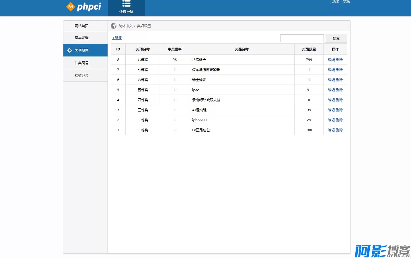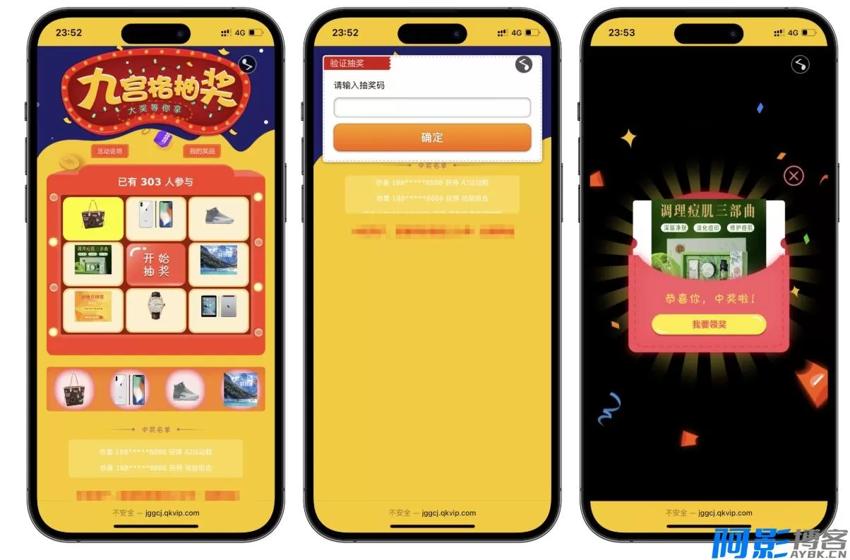 九宫格抽奖系统,后台可以自定义设置抽奖奖品,支持设置概率和数量,数量为0时不会抽中,可以生成抽奖码用于抽奖验证,没有抽奖码是无法抽奖的,抽奖码可以随机或者绑定指定抽奖奖品,功能能完善