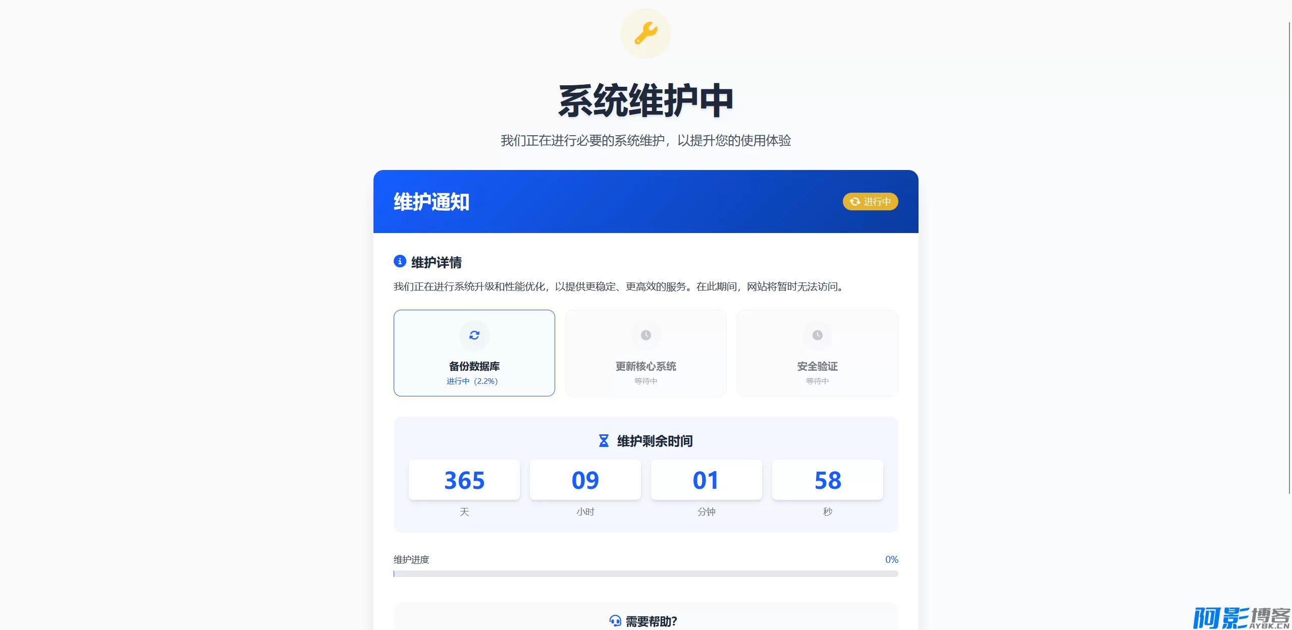 只需要设置好维护开始和结束时间,会自动依次按顺序显示三个页面,倒计时结束后会一直显示维护完成页面