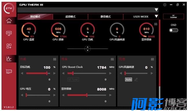 1.显卡超频:可自定义GPU和内存频率、电压,以达到更快的显卡速度。