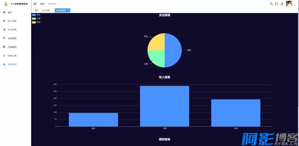 - 财务报表查看:系统自动生成可视化财务报表,展示月度/年度收支趋势、分类占比等关键数据,辅助用户进行财务分析