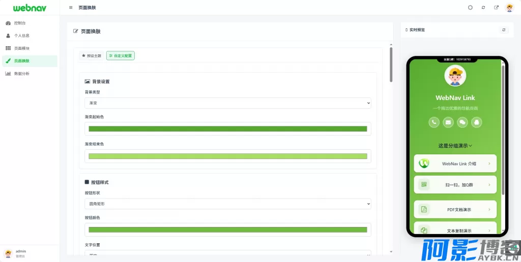 **自定义样式**:背景(纯色/渐变/图片)、按钮形状与颜色、文本对齐与配色、卡片阴影、徽标色、箭头显示与颜色等。