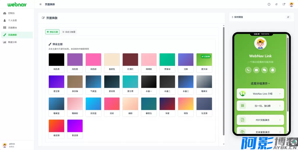 **预设主题**:多套风格卡片,点击即用,并会持久化记录当前主题。