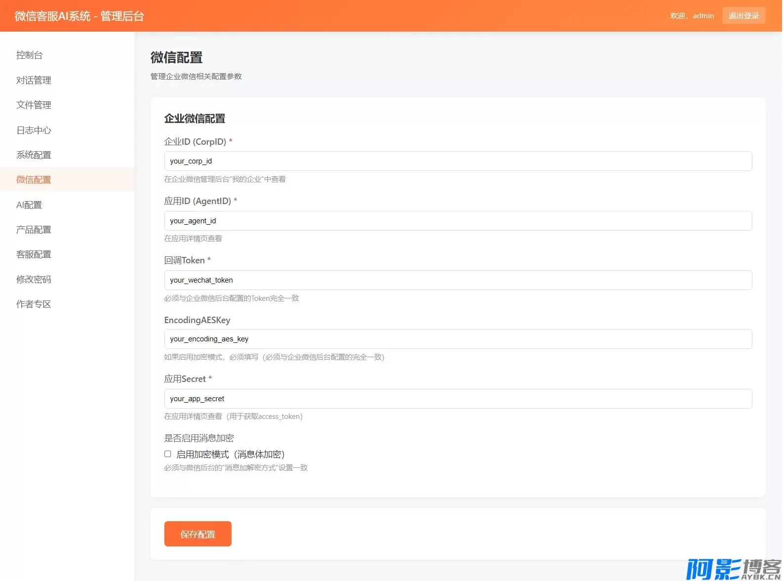 – ** 微信配置 **:配置企业微信 Token、AppID、Secret、加密密钥等