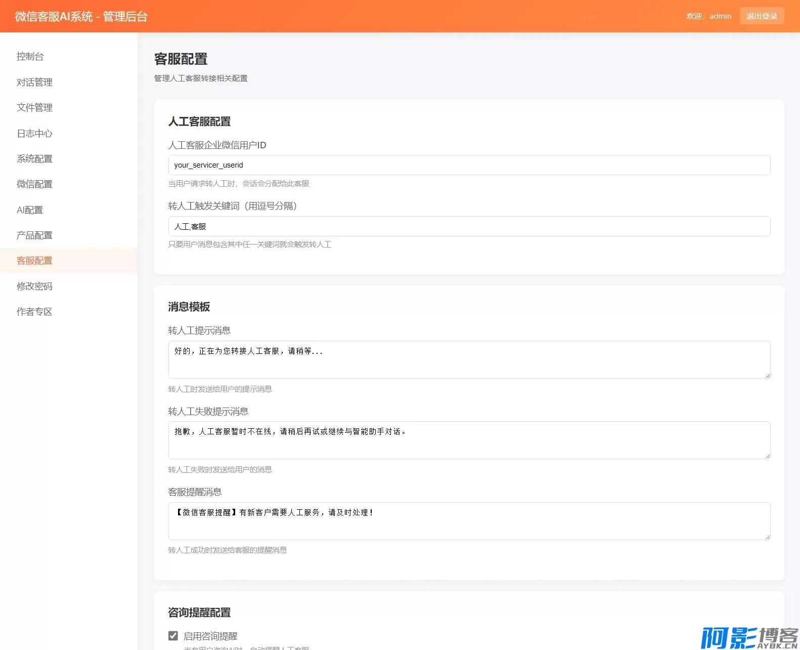 – ** 自动提醒 **:当有用户咨询 AI 时,自动提醒配置的人工客服