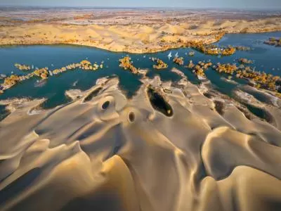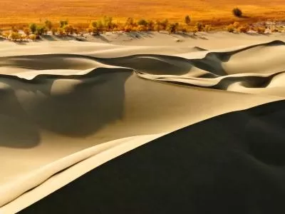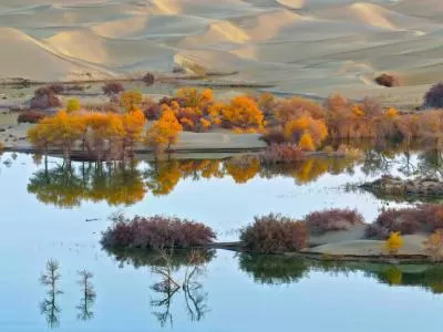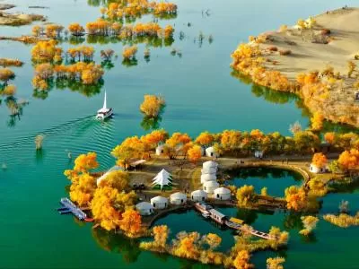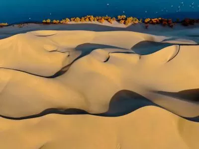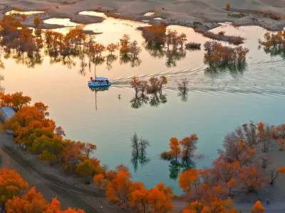 大漠浮瓠碧浪斜,胡杨列阵护明霞