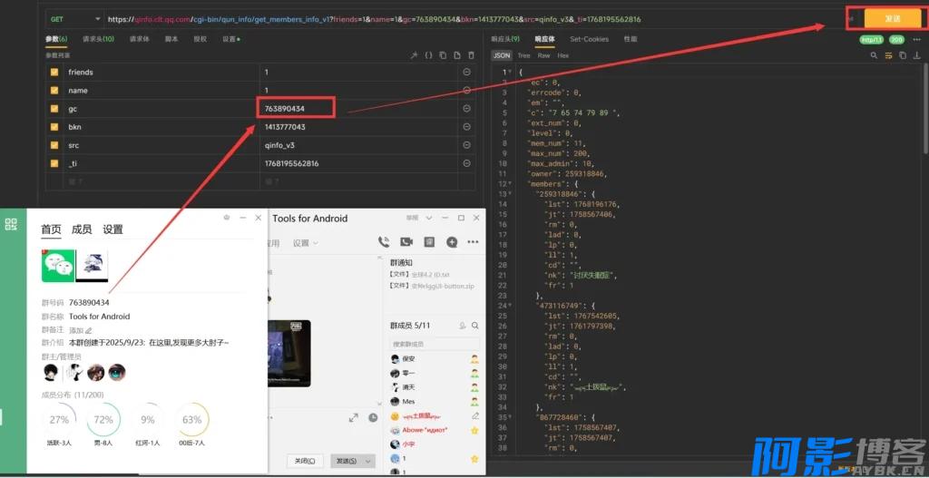 然后修改gc为其他群的账号,点击发送即可获取到其他群的所有群员信息,如图
