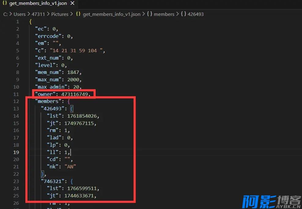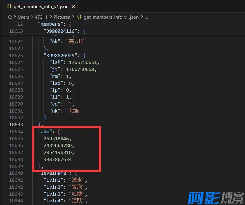 在JSON中我们可以看到,最上面的owner是群主账号,members则是全群成员账号,是包括了群主和管理员的,然后最下方的adm则是指明了管理员的账号,如图