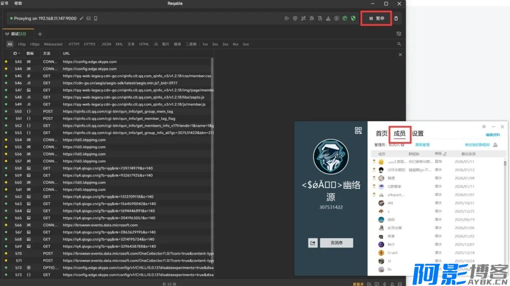 然后点击群资料的成员,等待成员加载完后,就可以点击Reqable的暂停了,如图