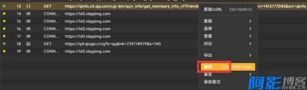上面的教程为提取自己管理的群的成员,如果自己不是管理或者群主是无法直接获取到成员信息的,但是上面在Reqable中已经有抓到自己管理的群的请求,我们只需要修改Q群号重发一次请求即可获取其他群的成员信息,如图对抓到的请求右键编辑