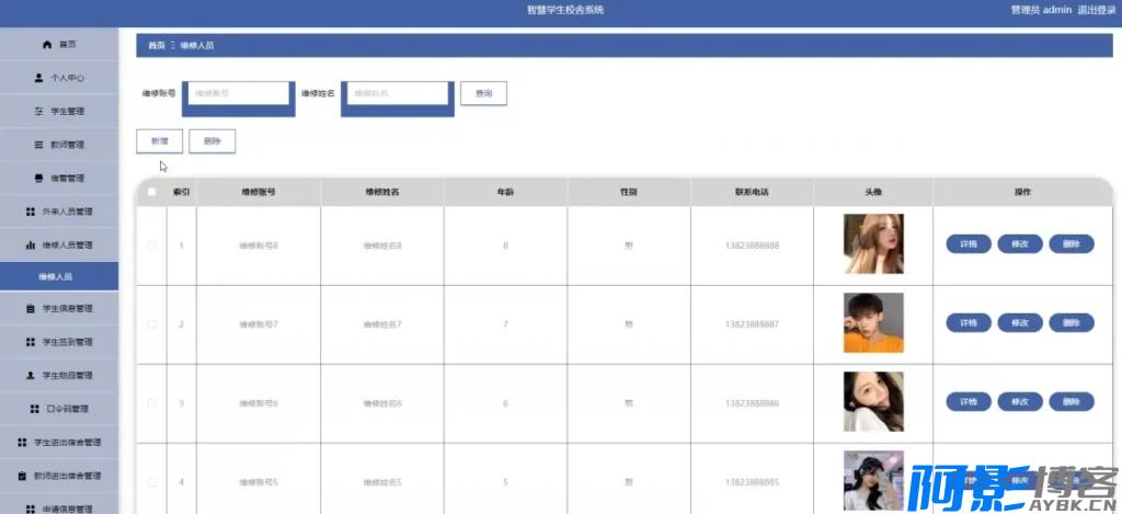 对宿舍管理员账号进行增删改查,绑定其负责的楼栋范围,实现分区责任制。 - 宿舍楼管理