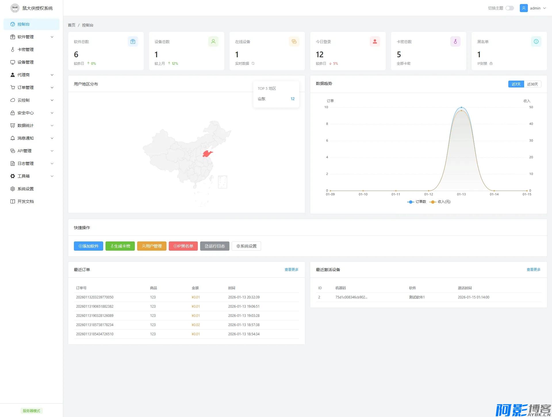 数据统计:控制台实时展示软件数、设备数、在线数、今日登录等数据