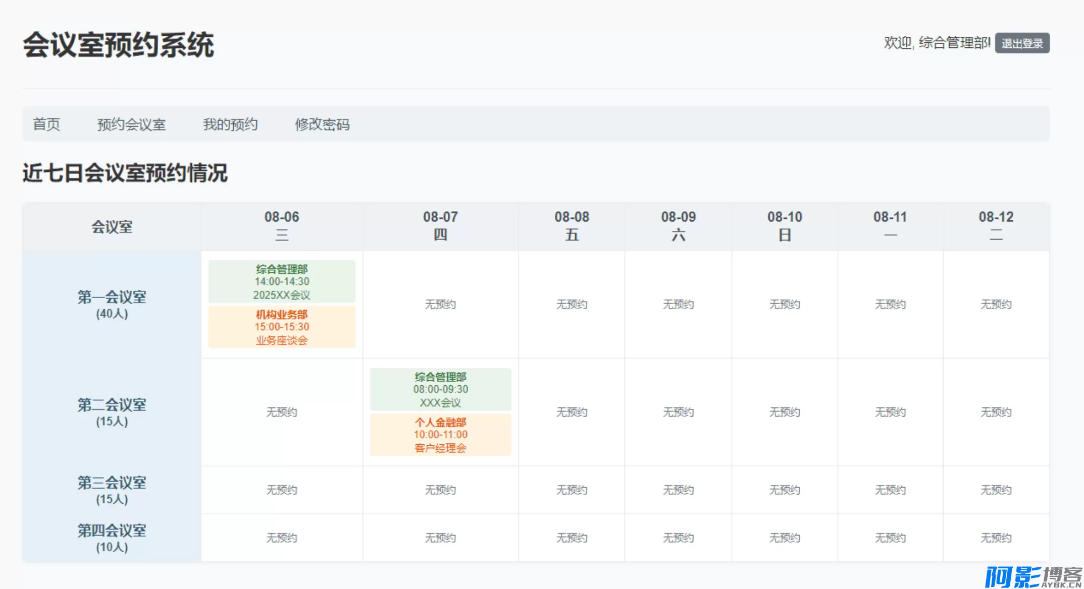 系统主页以日历表格形式展示所有会议室未来 7 天的预约安排