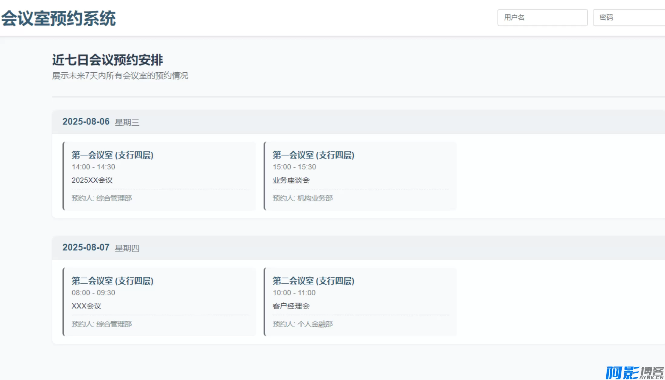 可视化日程展示:以日历视图和列表视图两种形式展示未来 7 天预约情况,支持按日期 / 会议室分组查看