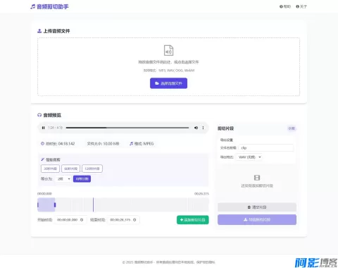 音频在线剪切助手网页版源码 所有音频处理均在本地完成 1. 上传音频 点击”选择音频文件”按钮或直接拖放音频文件到上传区域。支持MP3、WAV、OGG和WebM格式。 2. 智能裁剪功能 快速创建标准时长片段或...